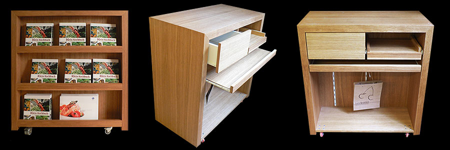 Der multifunktionale Schrank auf Rädern, ideal für den mobilen Einsatz auf Tournee im oder ausser Haus, integrierter Tisch, Lampe, Garderobe – all in one.